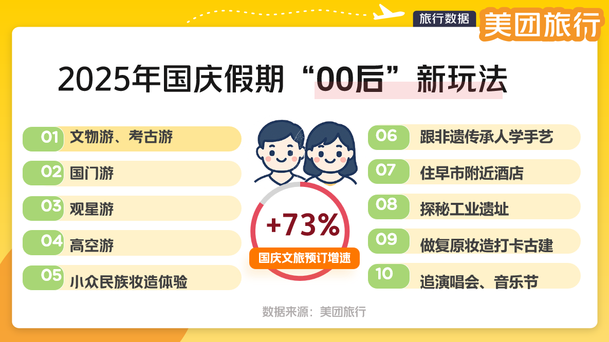 美团旅行相关负责人表示,国庆假期“文旅融合”成出游大趋势。“文旅+百业”带火更多旅游目的地,新玩法迭出。从神州“四极”到边城早市,从西沙群岛的玻璃海到塔克拉玛干沙漠中的达里雅布依村,从珠峰脚下的绒布寺到中国陆地最低点吐鲁番艾丁湖,00后年轻人走得更远、玩得更深刻。工业旅游、体育旅游等全新旅游模式兴起,吸引游客多住一晚,驱动本地旅游、餐饮、休闲玩乐等供给全面升级。美团旅行将联合更多高星酒店、景区乐园、航司、旅行社等推出国庆优质供给,同时筛选更多彰显农文体旅商融合发展的目的地及线路体验,助力旅游市场提质升级。